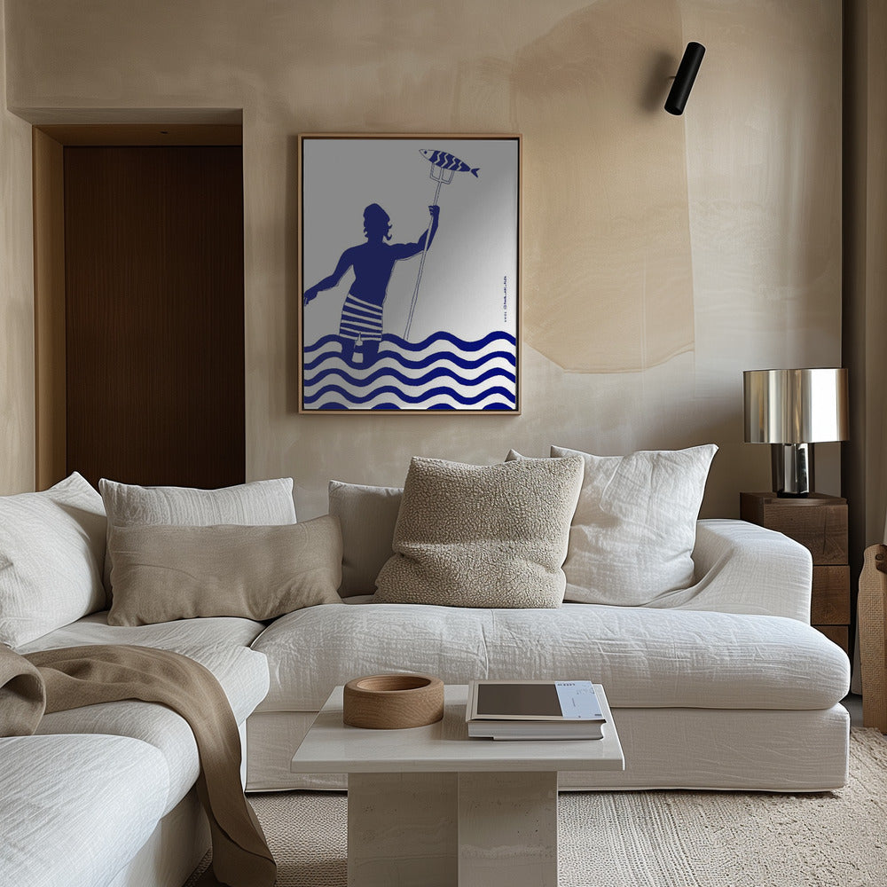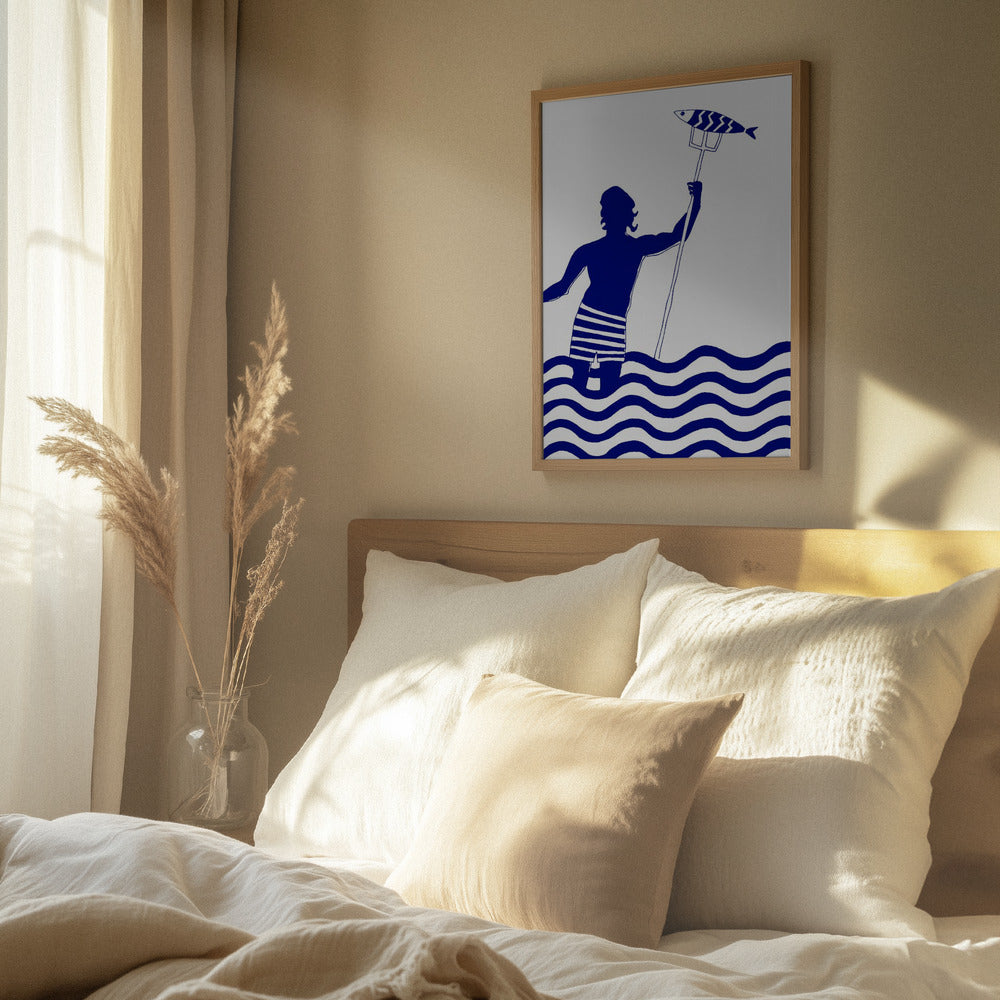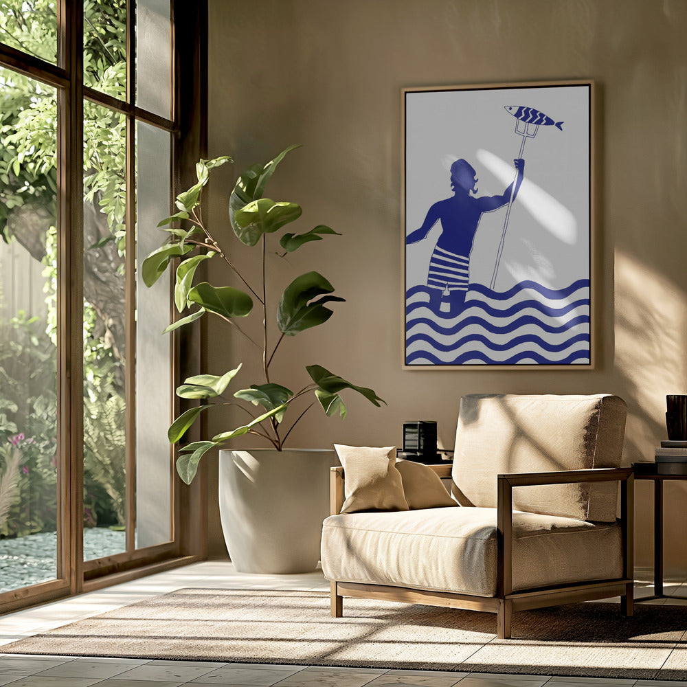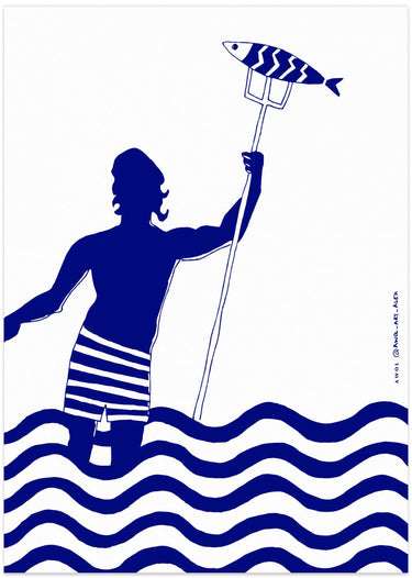 Impresión artística de playa náutica con un hombre pescando en el mar, del dios griego moderno Poseidón · cuadro de decoración