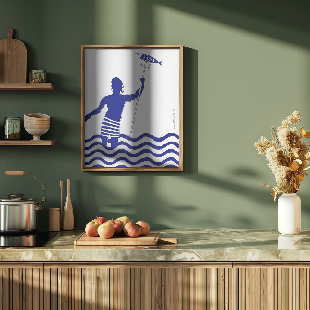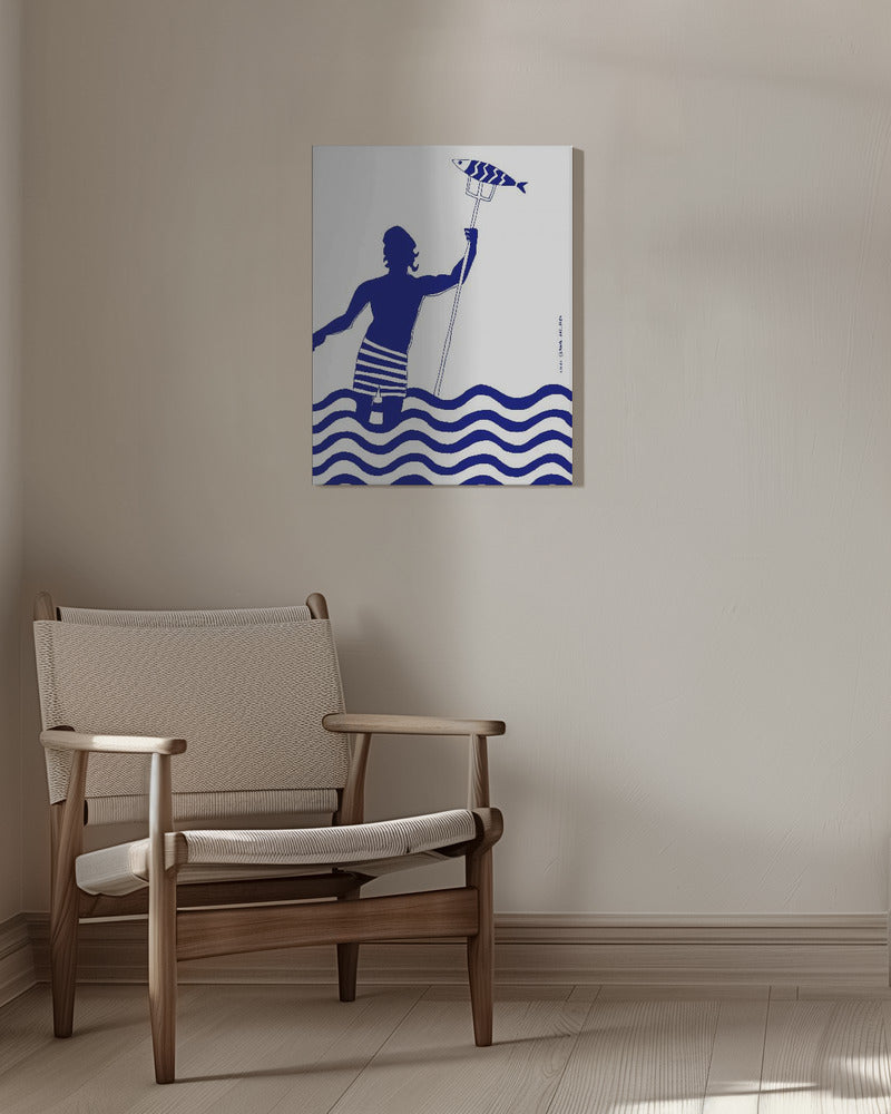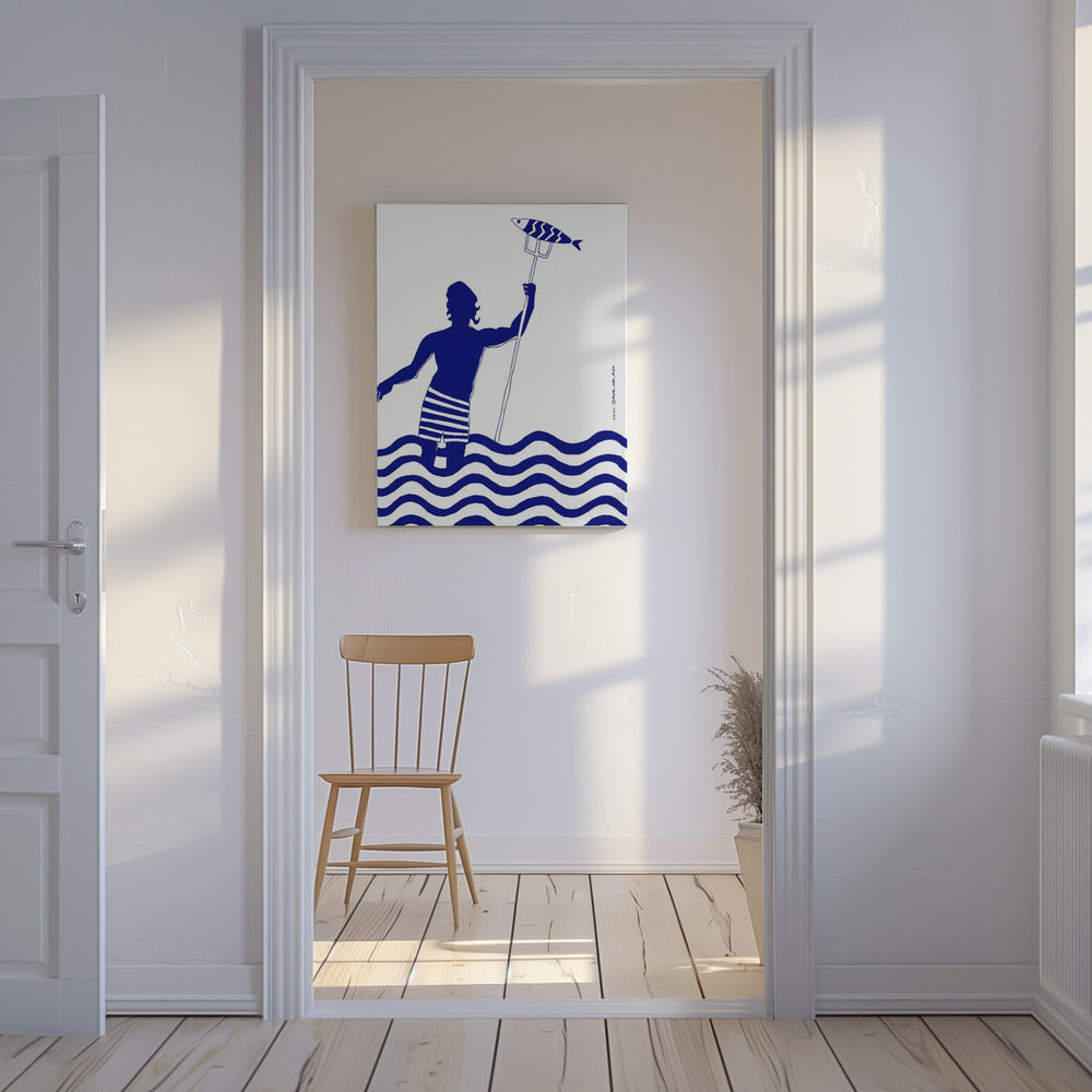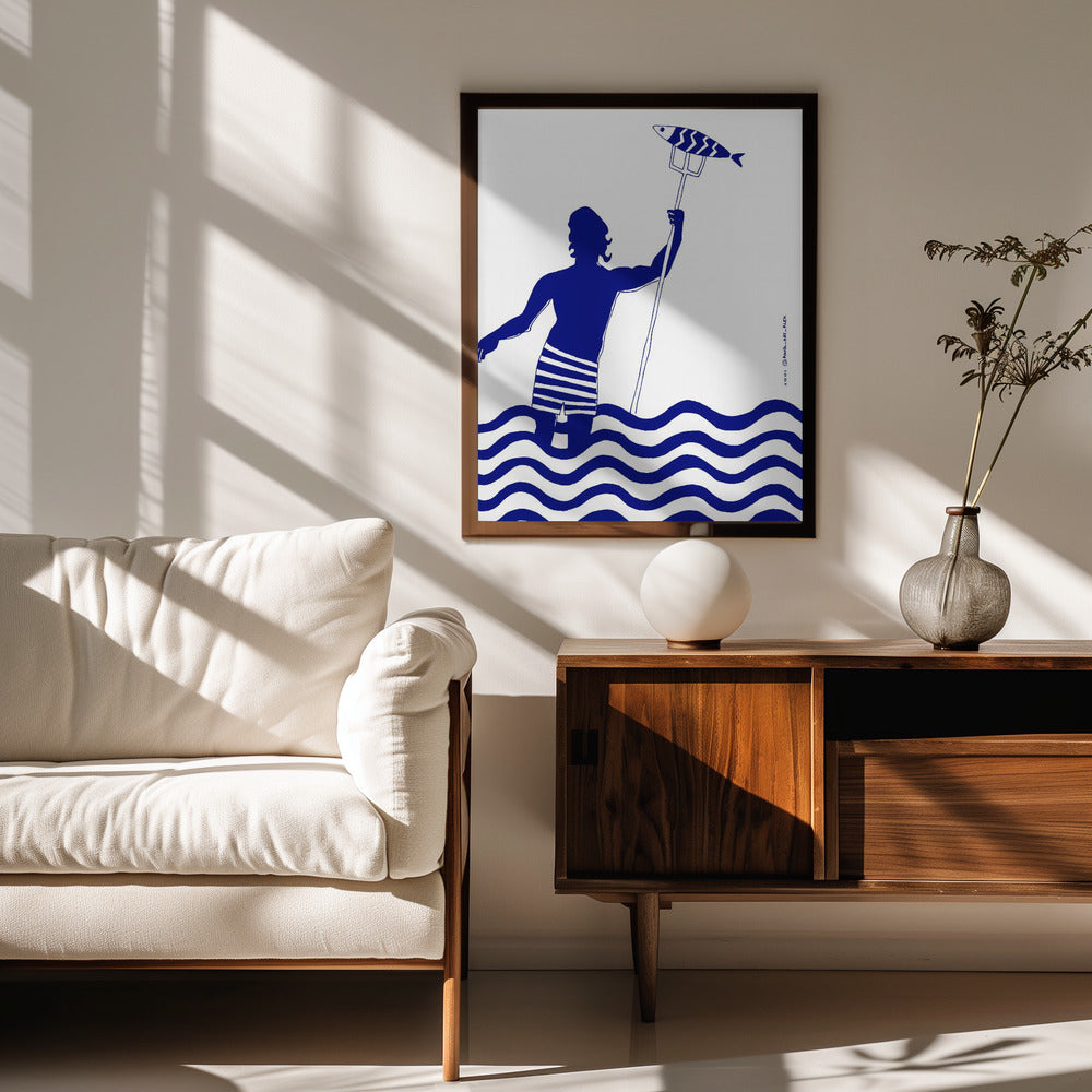 Impresión artística de playa náutica con un hombre pescando en el mar, del dios griego moderno Poseidón · cuadro de decoración