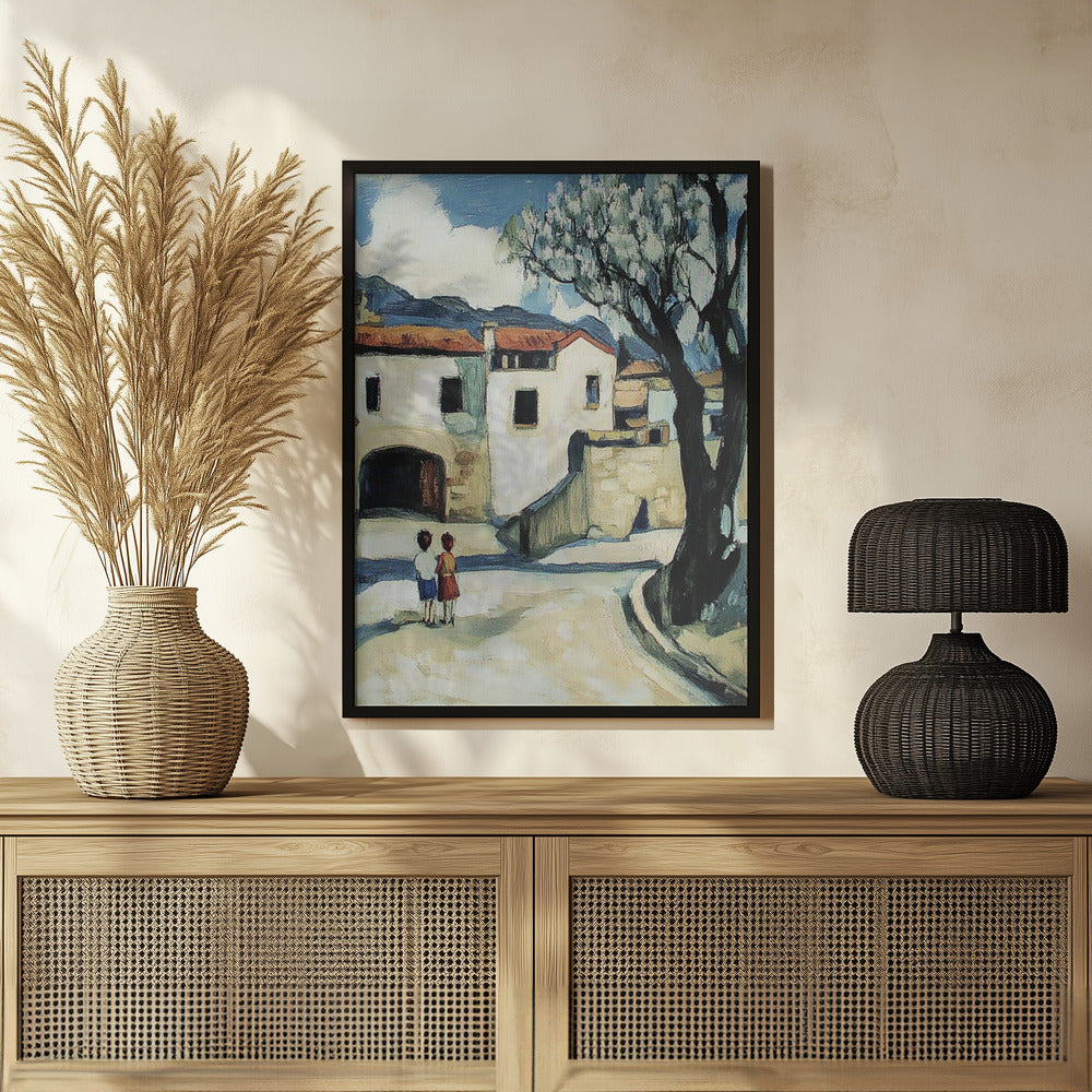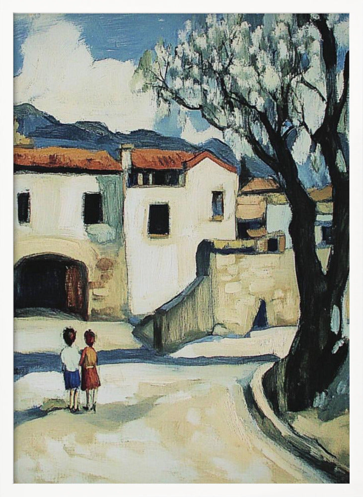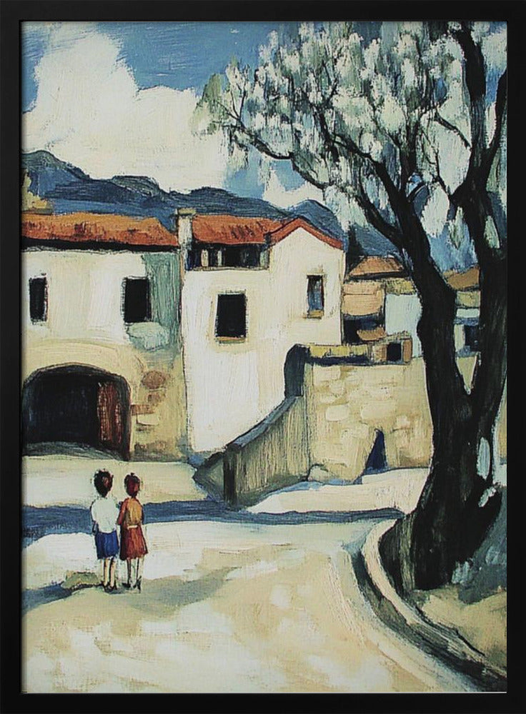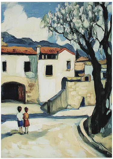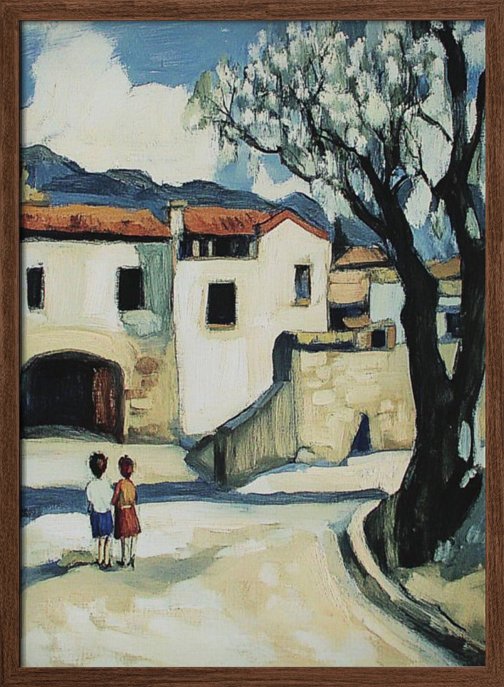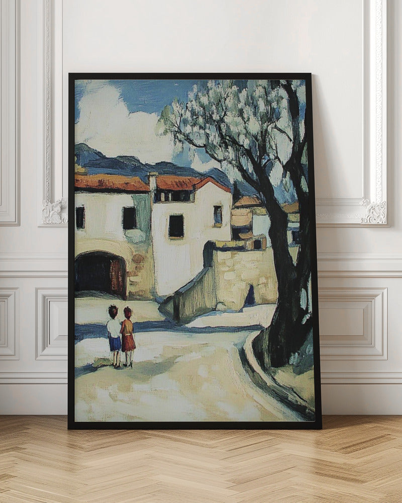 Niños con vistas a un pueblo de montaña · cuadro de decoración