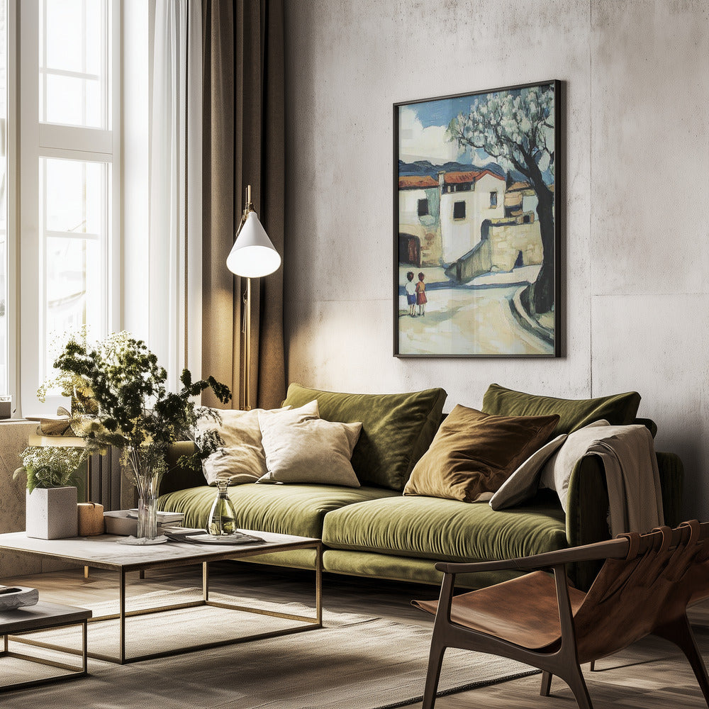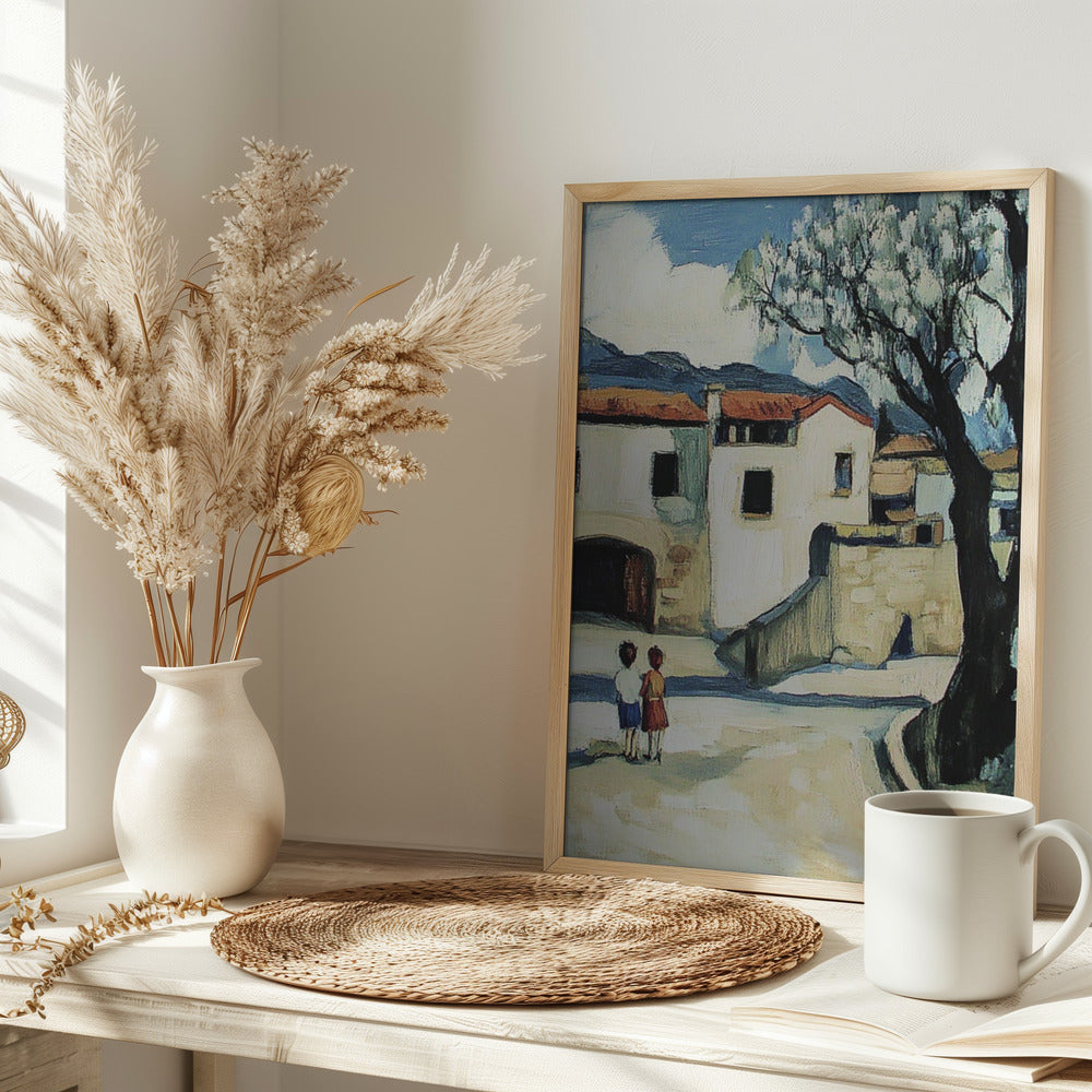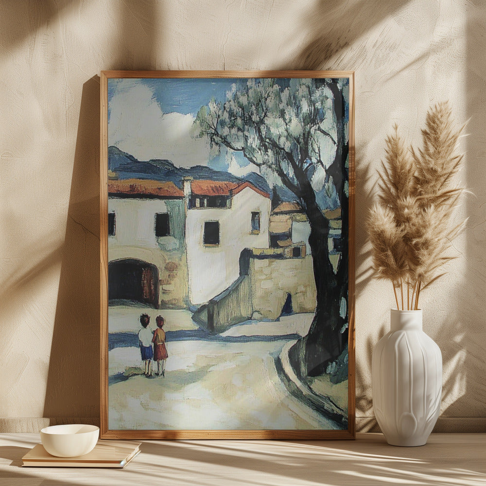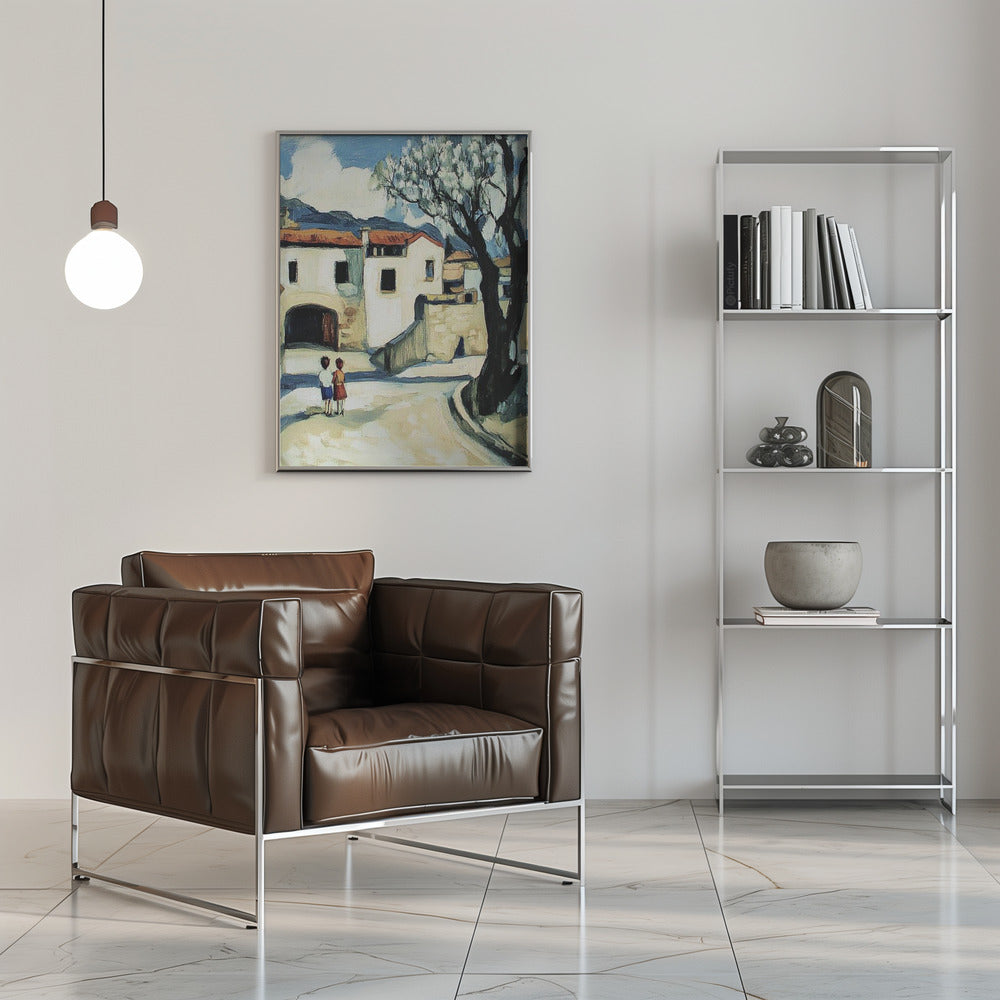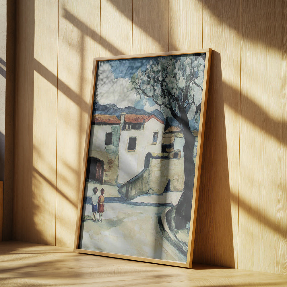 Niños con vistas a un pueblo de montaña · cuadro de decoración