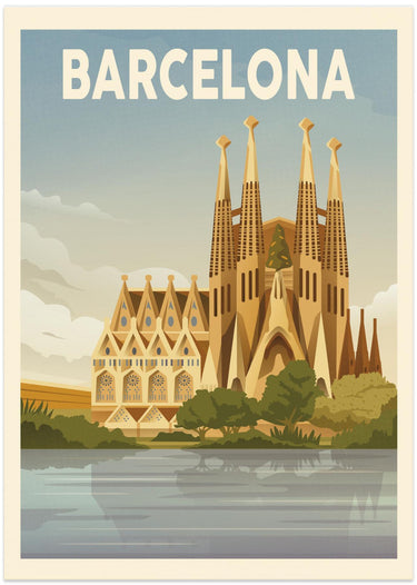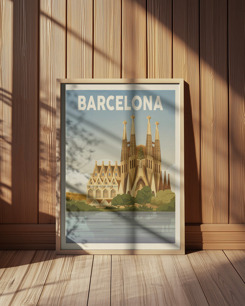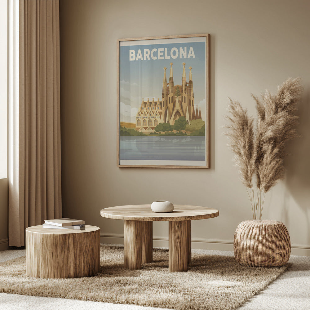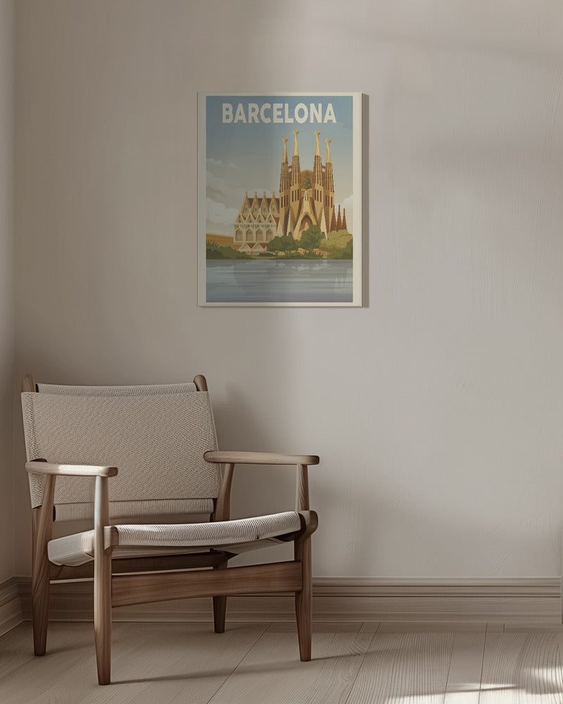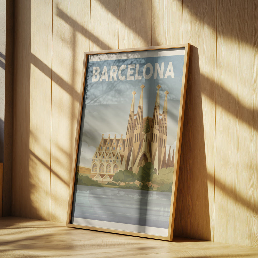 "Barcelona Travel Print" por Retrodrome. Impreso en papel mate de primera calidad, lienzo o papel de calidad de museo. Elija entre un marco de madera opcional.