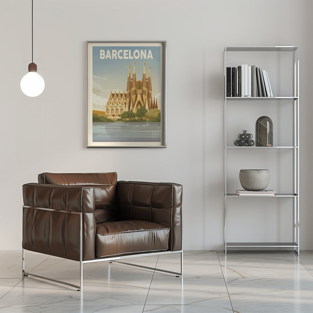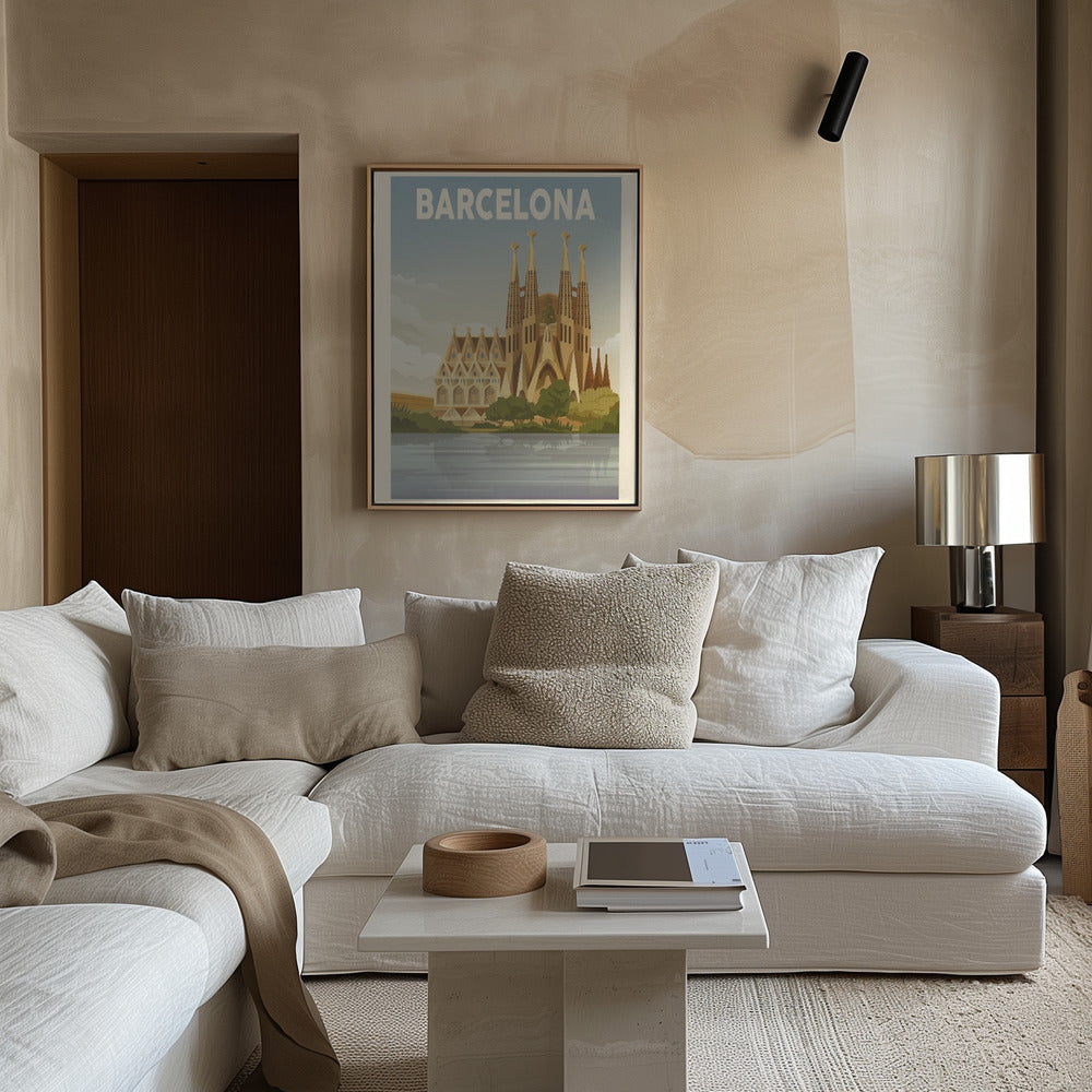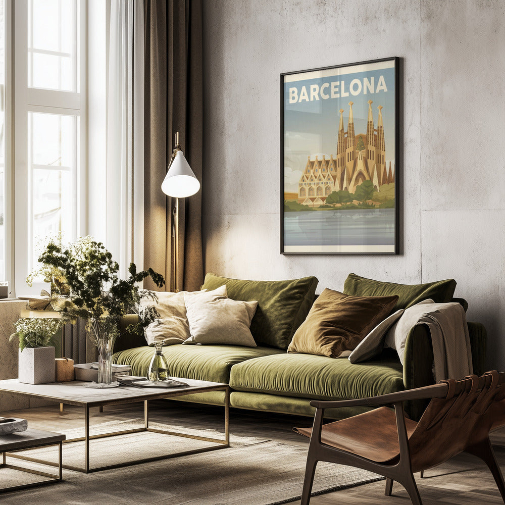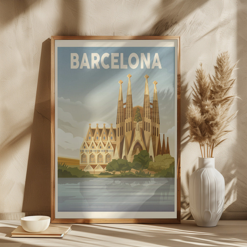 "Barcelona Travel Print" por Retrodrome. Impreso en papel mate de primera calidad, lienzo o papel de calidad de museo. Elija entre un marco de madera opcional.