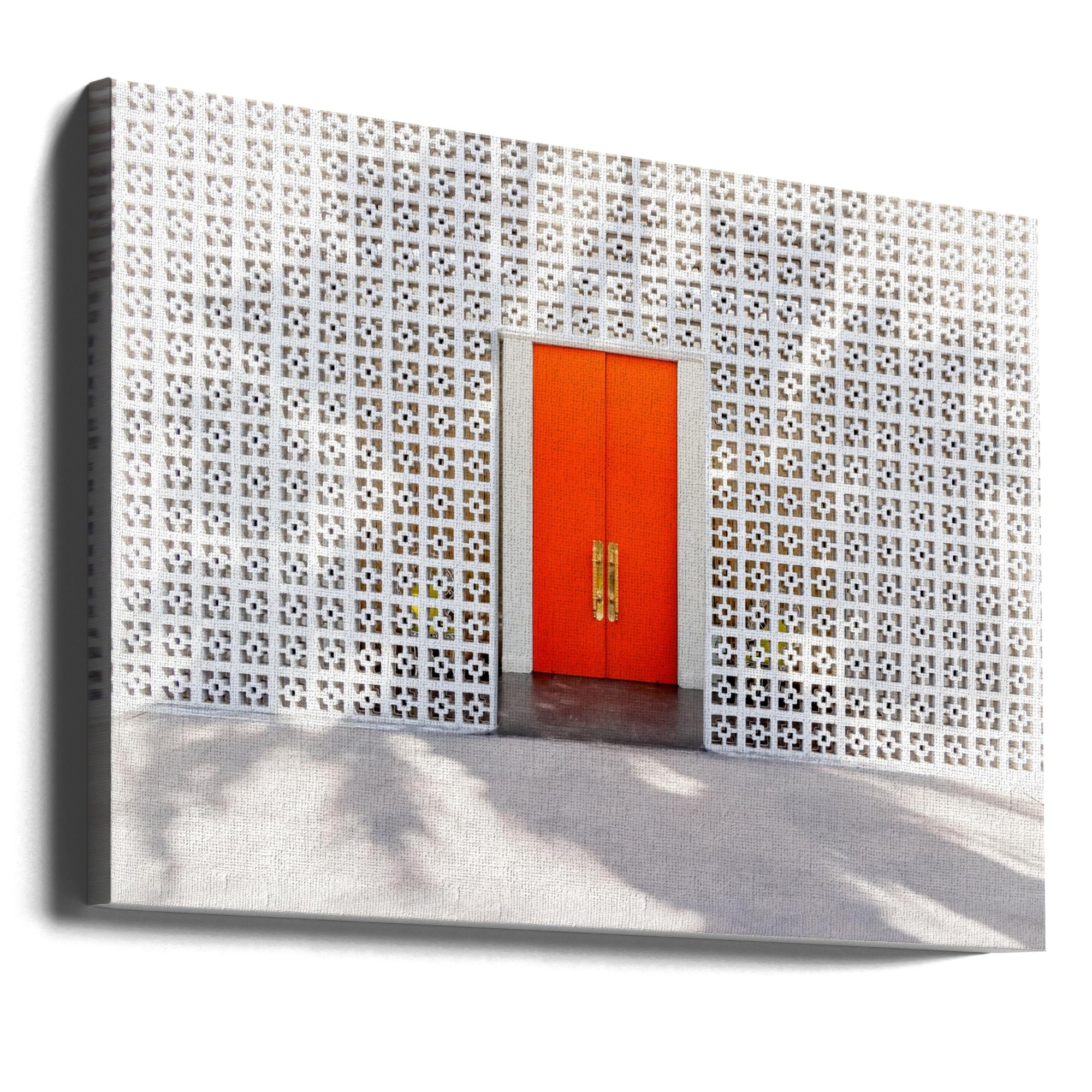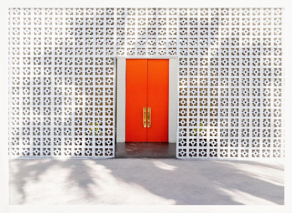 Puerta naranja en una pared de bloques de hormigón · cuadro de decoración