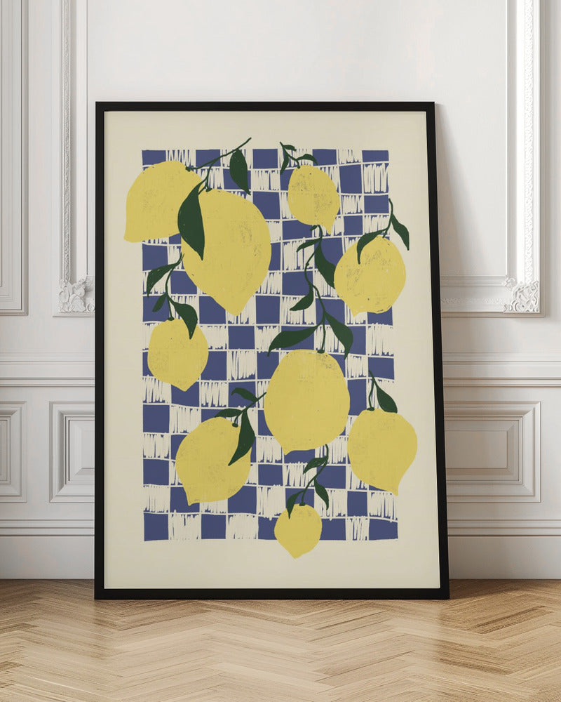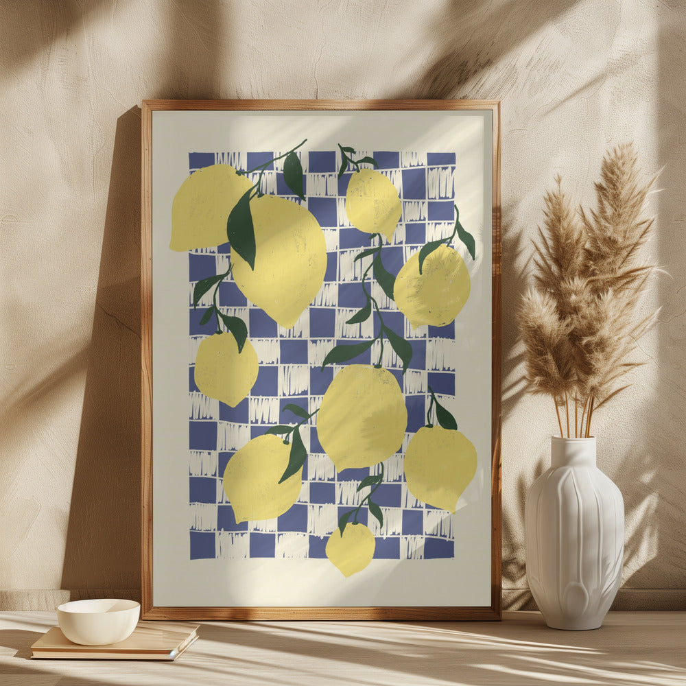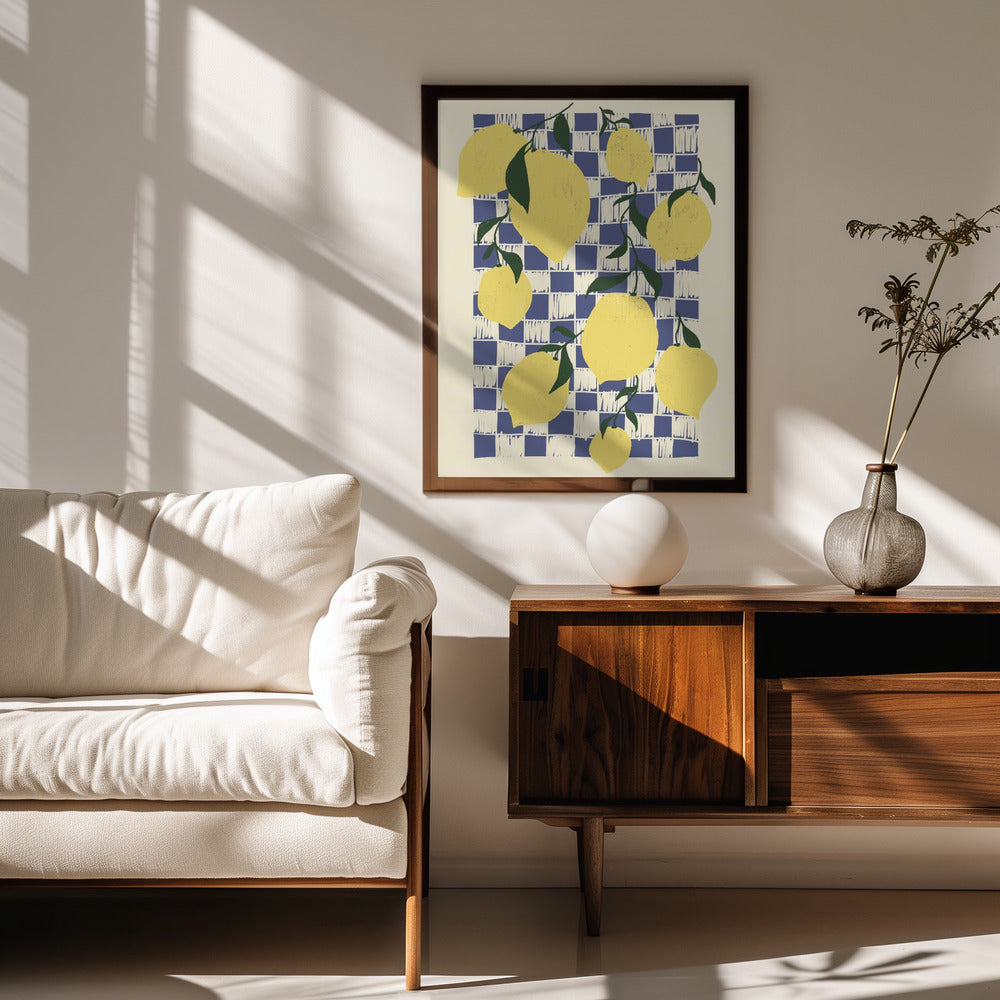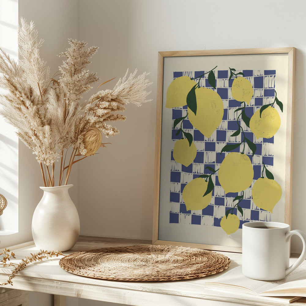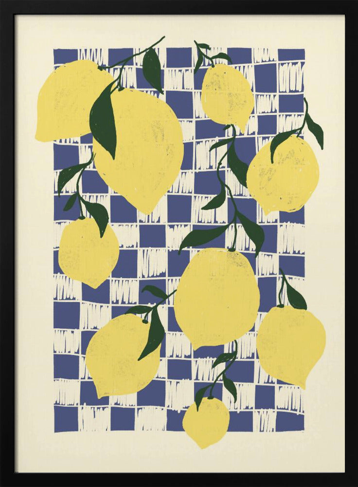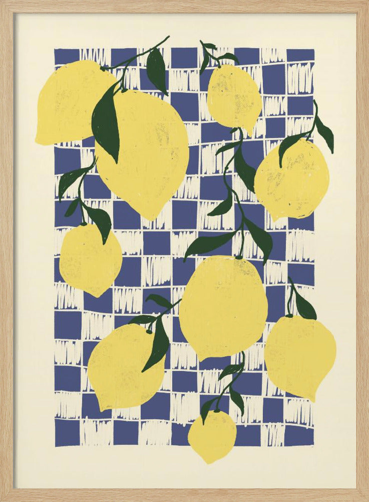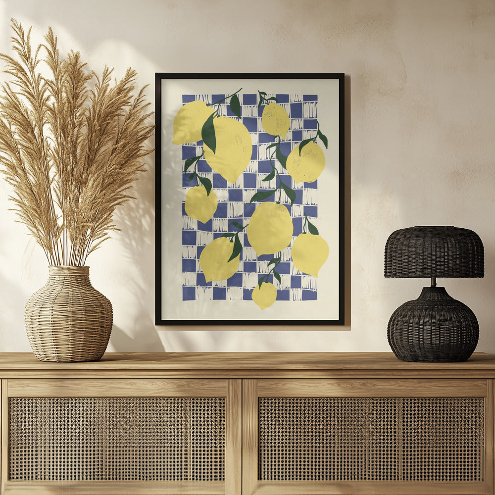 Un montón de limones sobre un fondo de azulejos azules · cuadro de decoración